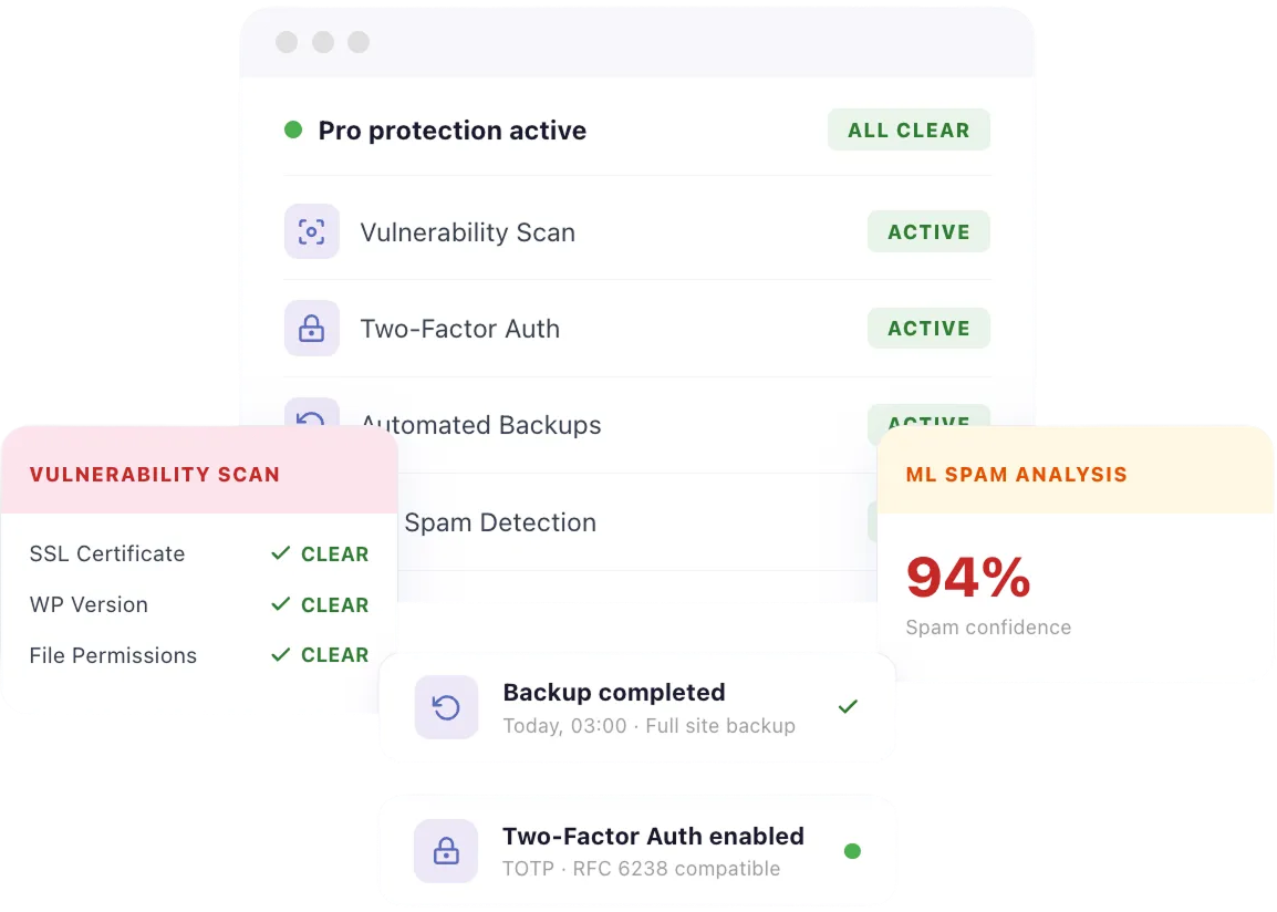 You’re already protected with Titan. Pro adds machine learning spam detection, two-factor authentication, automated backups, and vulnerability monitoring.